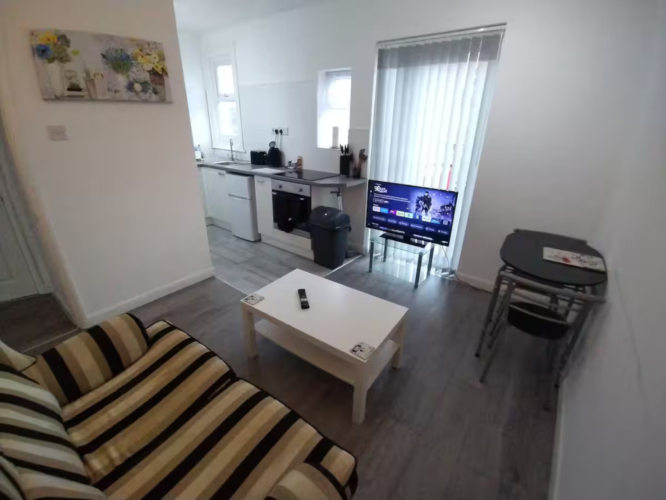 Your own private open plan living area with kitchen, comprising, hob, oven, fridge freezer, sink and work top with extra cupboard space.